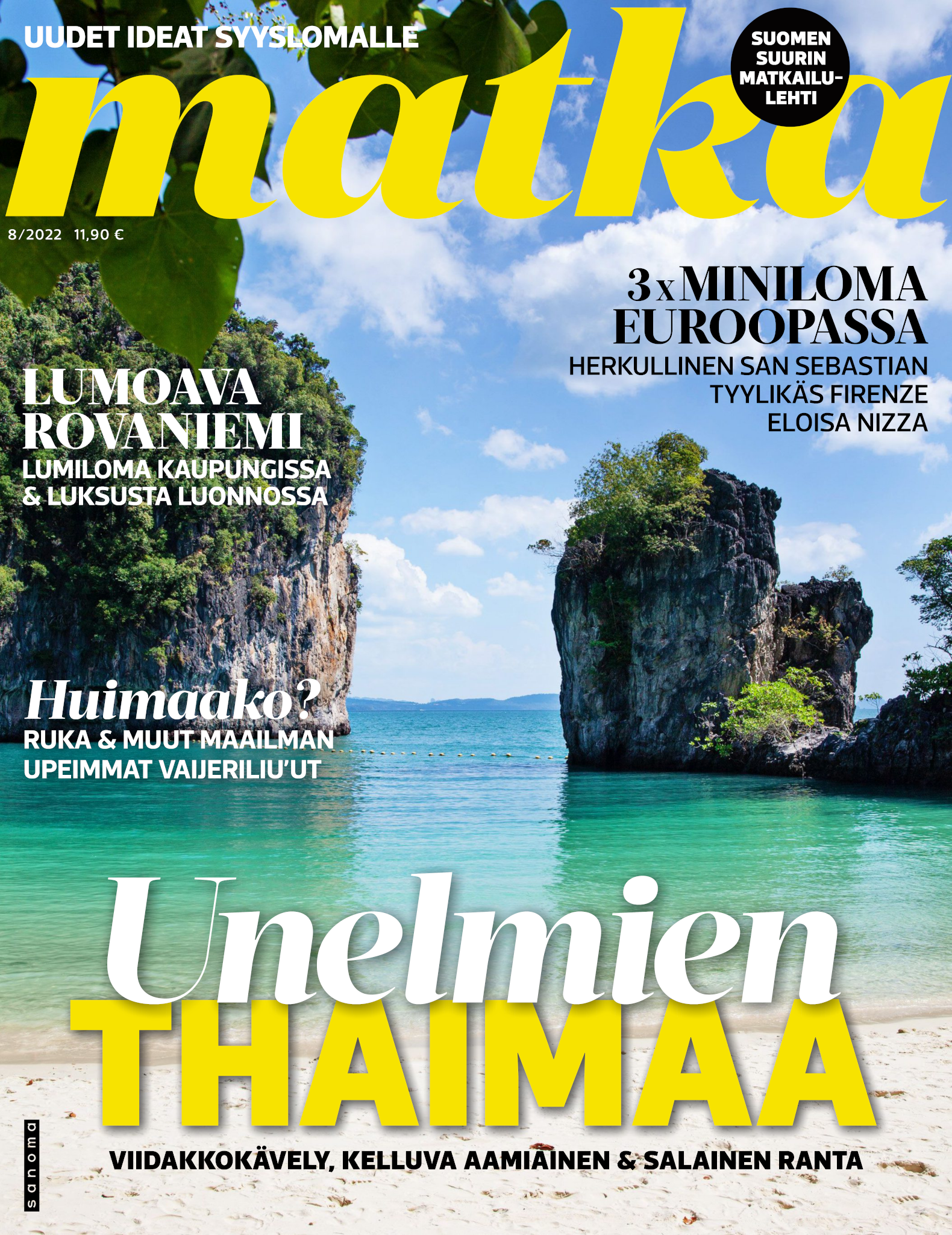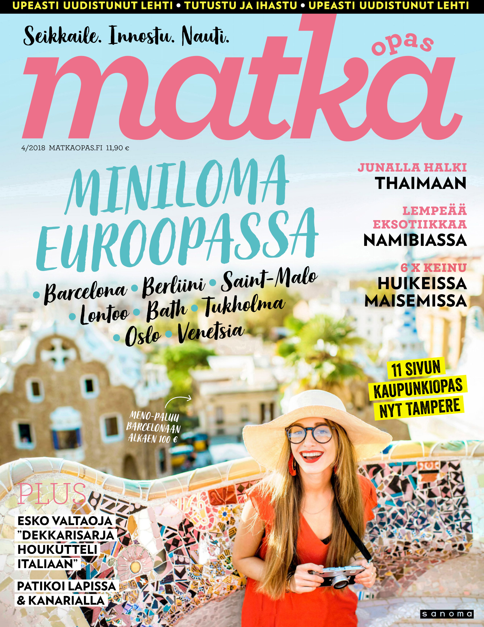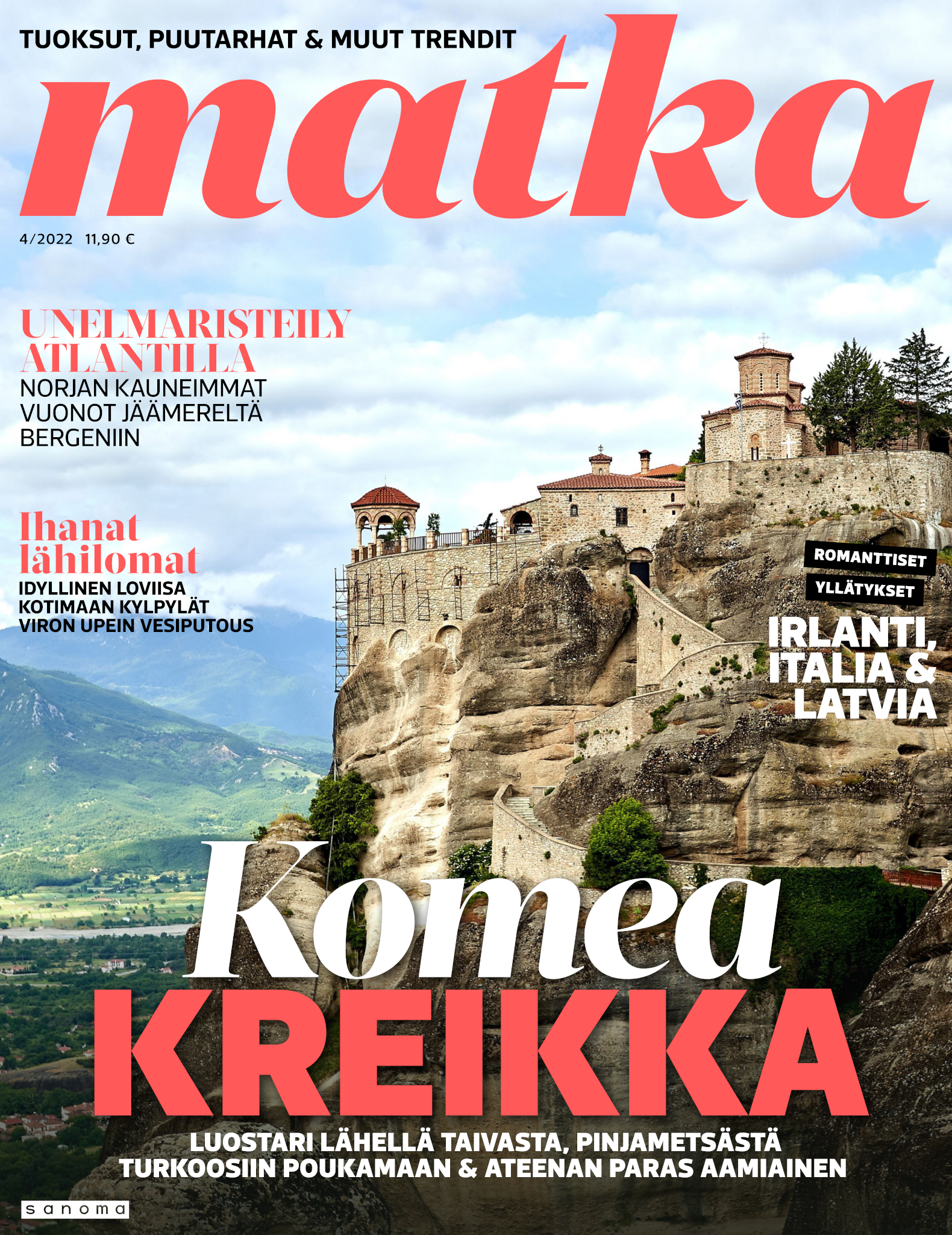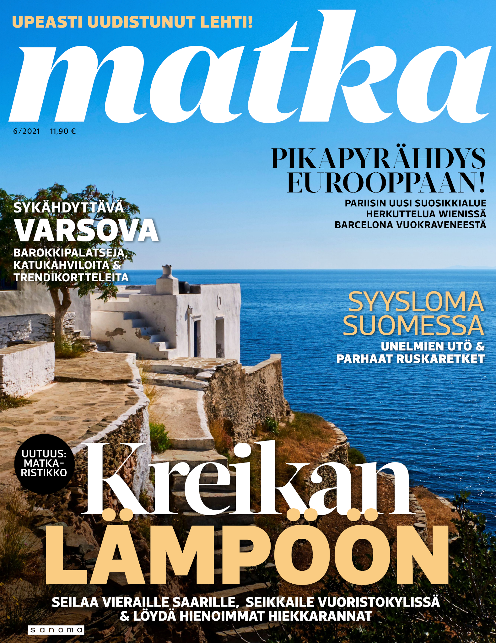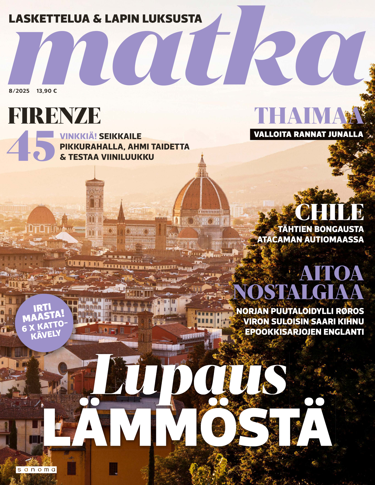 Upea Matka-lehti auttaa unelmoimaan juuri siitä seuraavasta matkasta ja antaa vinkit tuleviin reissuihin. Olipa sitten kohteesi kotimaassa tai ulkomailla, kerromme ja näytämme sinulle ihanien ja kiinnostavien kohteiden parhaat palat. Matka-lehdessä on matkakohteita jokaiselle kukkarolle ja erilaisille matkaajille. Uuutuuskohteita, kaupunki- ja rantalomia, räätälöityjä matkoja ja unelmien kaukomatkoja. Ja tottakai myös upeita nojatuolimatkoja! Jokaiselle jotakin! Matka-lehden avulla voit aloittaa seuraavien matkojen suunnittelun jo kotisohvallasi. Onko seuraava kohteesi lähimatka? Haluatko nauttia Lapin lumosta? Vai kutkuttaako kaukomatka jo? Matka-lehdestä löydät nämä kaikki ja paljon muuta. Matka - minne seuraavaksi?